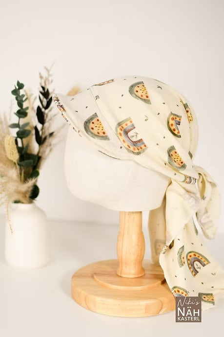 Angenehm kühlend, temperaturausgleichend und mit natürlichem UV-Schutz – dieses Tuch aus feiner Wolle-Seide-Mischung ist perfekt für warme Tage. Durch die Bindetechnik passend für einen Kopfumfang bis ca. 54cm (ca. 14 Jahre) und ideal für empfindliche Haut.