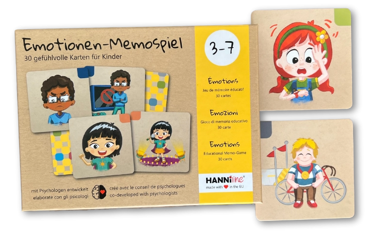 Wütend, glücklich, ängstlich? Mit dem liebevoll gestalteten Memospiel von Hanniline lernen Kinder ab 3 spielerisch 15 Gefühle kennen – mit 30 großen Karten, klarem Design und jeder Menge Gefühl!
